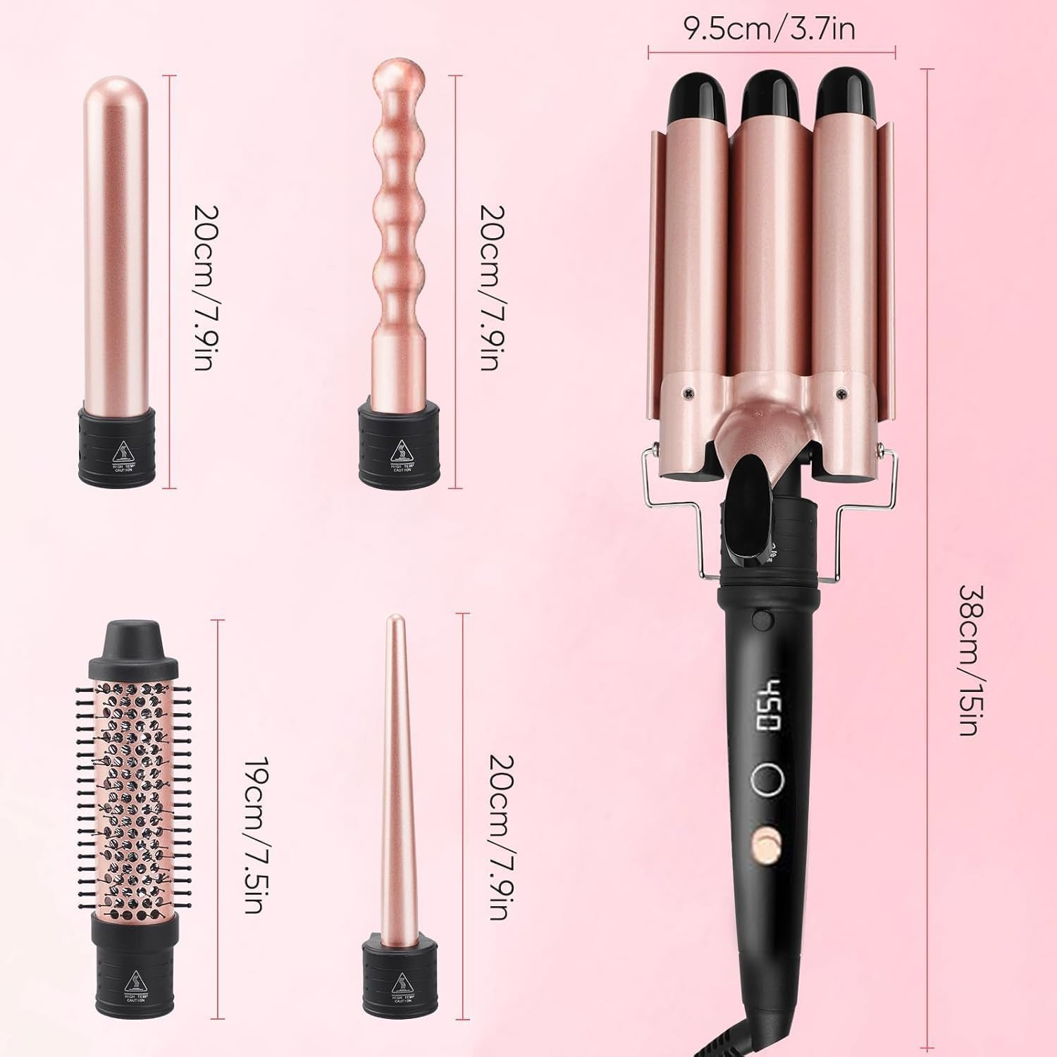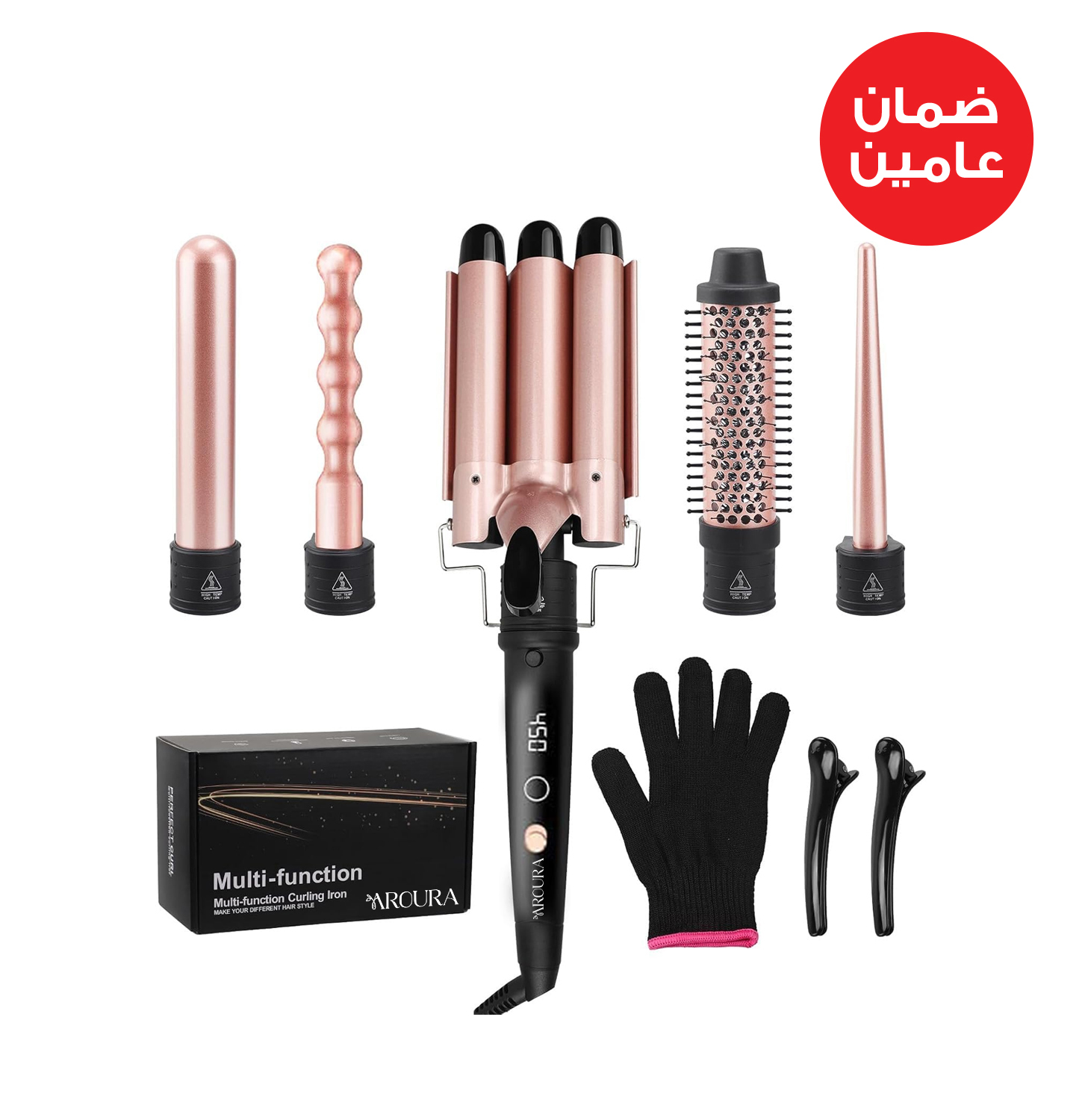 • جهاز تمويج الشعر من Aroura يوفر لك تموجات طبيعية ومتنوعة بفضل 5 رؤوس سيراميك تورمالين قابلة للتبديل (من 9–32 ملم).